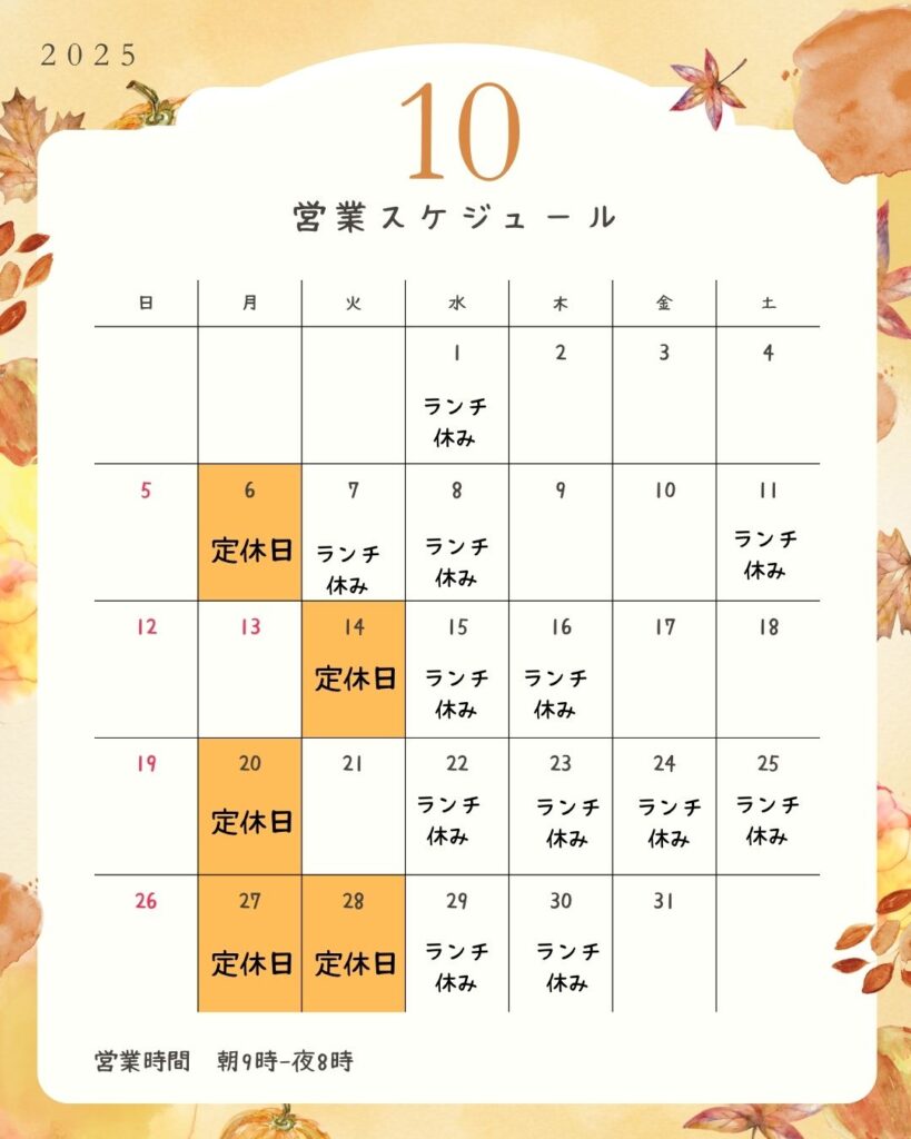トップページ > お知らせ > 10月の営業ご案内 2025/10/03 10月の営業案内です 宿泊等の都合により、ランチ営業ができない日が多くなっております。ご理解のほどよろしくお願いいたします。 今月は毎年恒例のあけぼの大豆収穫イベントもございます。詳細は追ってご連絡いたします楽しみのお持ちくださいませ! - お知らせ