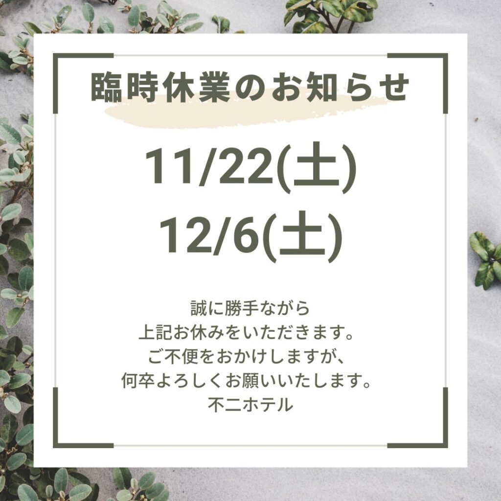 トップページ > お知らせ > 11月22日(土)臨時休業となります 2025/11/21 明日、11月22日(土)は都合により臨時休業とさせていただきます。 翌、23日(日・祝)・24日(月・振休)は通常通りの営業となります。 - お知らせ