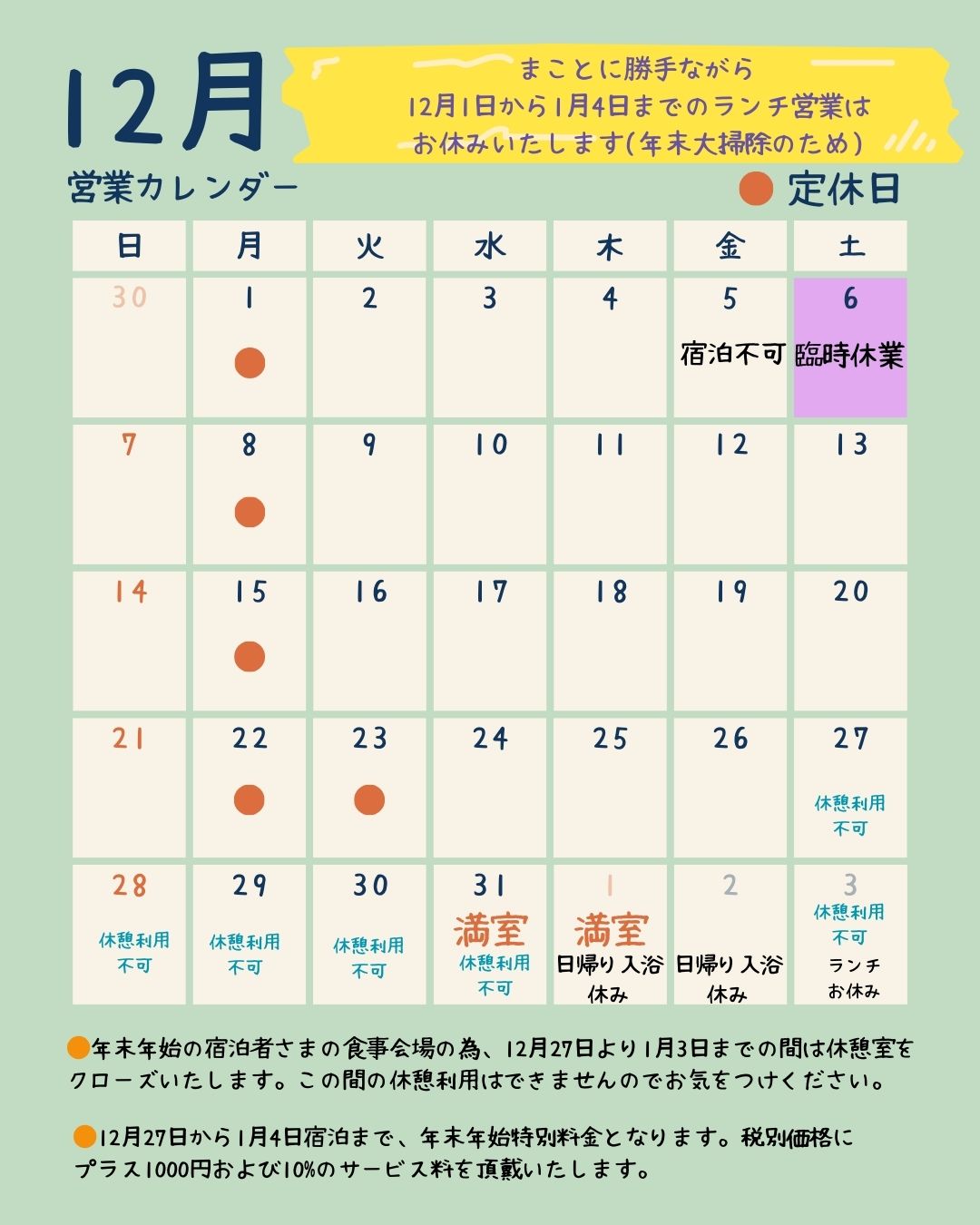 トップページ > お知らせ > 12月と年末年始の営業ご案内 2025/12/01 早いもので12月。いよいよ気忙しい時期に突入です。1年の汚れをきれいにする大掃除の時期がやってまいりました。 12月は勝手ながら日帰りランチプランをお休みとさせていただきます。ご利用をお考えでしたお客様には大変申し訳ございませんが、ご理解のほどよろしくお願いいたします。 12月の営業予定です。ご確認の上ご利用くださいますようお願いいたします。 - お知らせ