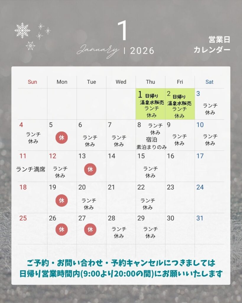 トップページ > お知らせ > 1月の営業ご案内 2025/12/26 1月の営業のご案内です元旦・2日は宿泊以外の全ての営業はお休みとなります。温泉水販売も3日からとなりますのでご注意ください。 - お知らせ